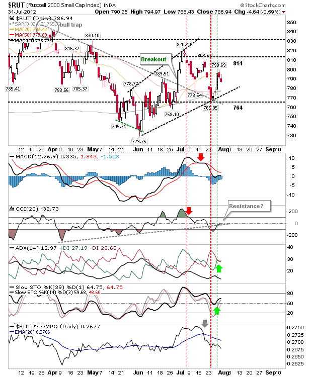 There was a registered a distribution day across key markets, but the distribution had more to do with Monday's light trading rather than Tuesday's heavier selling. The loss in price was mild and fit with a orderly pull-back, maintaining the consolidation begun after last week's late gains. Little else to add but just the charts: