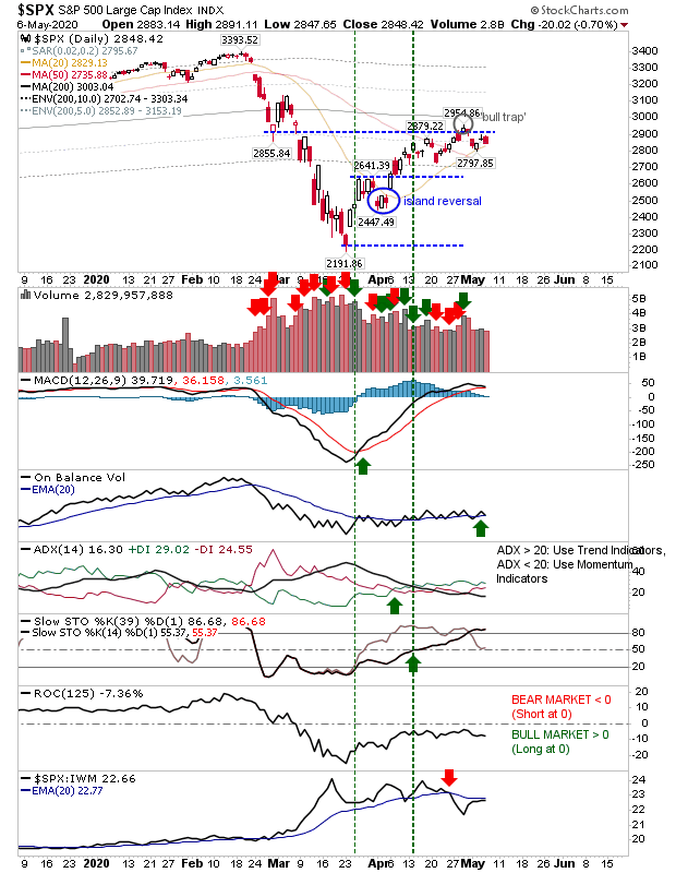 The S&P had a small bearish engulfing pattern to yesterday's doji. On a positive front, yesterday's action closed the breakdown gap even if it ultimately wasn't able to challenge the 'bull trap'.