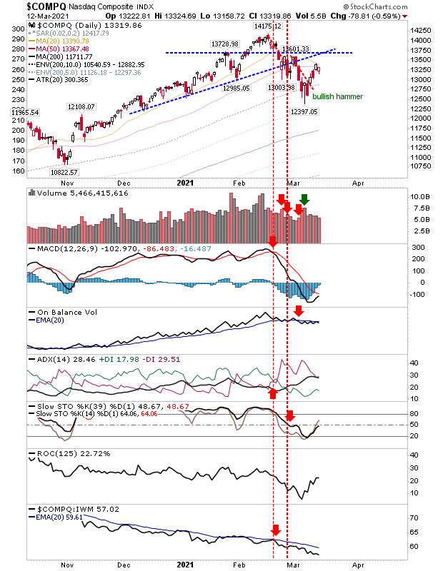 The Russell 2000 has also made it to new all-time highs with technicals suitably bullish. Like the Dow Industrials Average, this is an index seeing falling volume at new highs - which isn't great - but price is the lead.The Nasdaq rebounded off its 20-day MA in modest action. Technicals are still net negative as it remains some way off its highs.